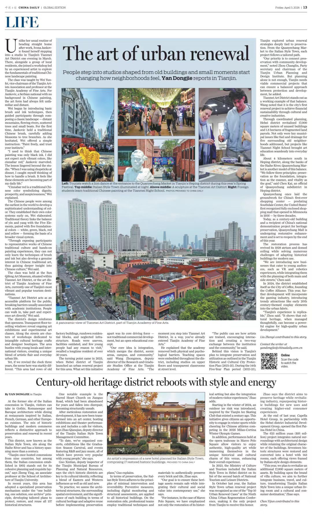 近日,《中国日报》整版聚焦天津城市焕新的智慧实践,其中天美艺术街区作为典型案例引发广泛关注。这里,曾是老旧的厂房与破败的居民楼,如今已蝶变为艺术与市井交融、校园与社区共生的活力街区。从塞尔维亚友人在天美夜校第一次拿起中国毛笔,到魏云飞教授“放开去画”的耐心指导;从通透的落地窗让课堂与街景相映,到“四区联动”模式打破校园与城市的边界——天美艺术街区不仅是天津首个依靠文创产业实现可持续运营的城市更新项目,更是天津美术学院以艺术服务社会、以文化赋能城市的生动场景。本期推送,让我们跟随《中国日报》的镜头与文字,一同走进这片“没有围墙的美院”,感受艺术如何让老城新生。